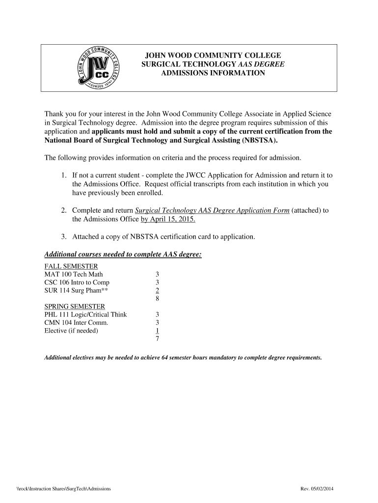 JOHN WOOD COMMUNITY COLLEGE SURGICAL TECHNOLOGY AAS DEGREE ADMISSIONS INFORMATION Thank you for your interest in the John Wood Community College Associate in Applied Science in Surgical Technology