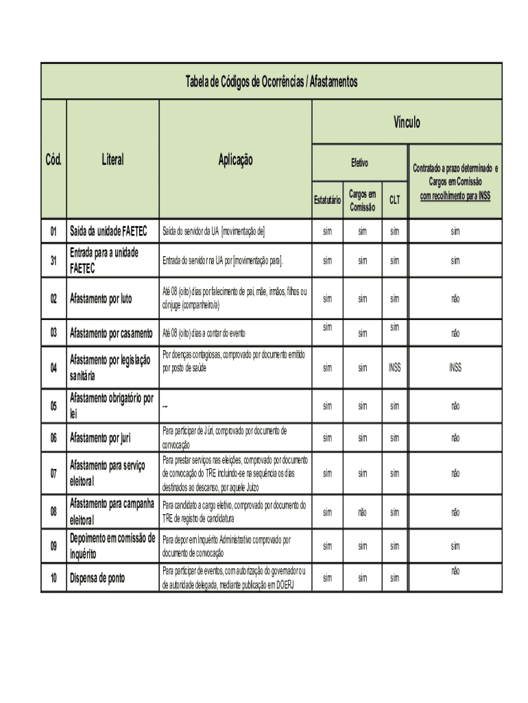 Tabela de Cdigos de Ocorrncias / Afastamentos Vnculo Cd.LiteralAplicaoEfetivo EstatutrioCargos em ComissoCLTContratado a prazo determinado e Cargos em Comisso com recolhimento para INSSSada da unidade