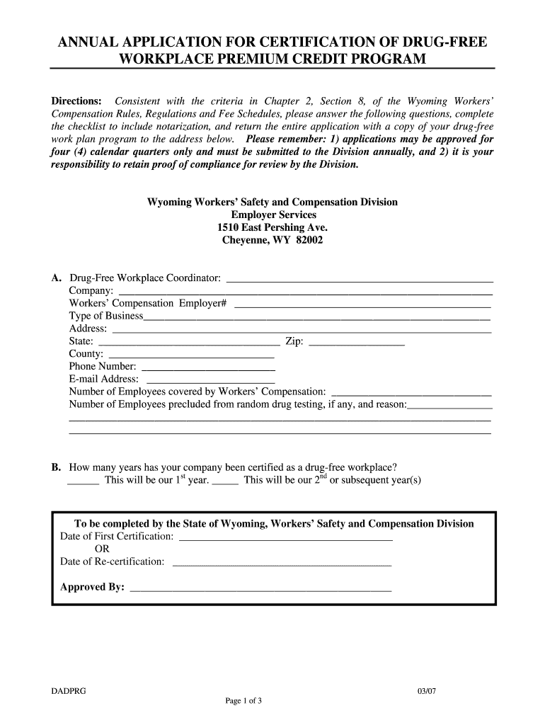 The Wyoming Drug-Free Workplace Certification Application is a crucial form for employers, allowing them to apply for certification under the state’s drug-free workplace program. This application is essential for obtaining the Drug-Free Workplace Certification Premium Credit, which can significantly benefit employers in Wyoming. By understanding the application’s purpose, businesses can ensure they meet the necessary eligibility criteria for certification.