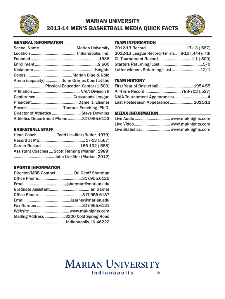Marian University 201314 Men Basketball Media Quick Facts General Information School Name.................................... Marian University Location............................................
