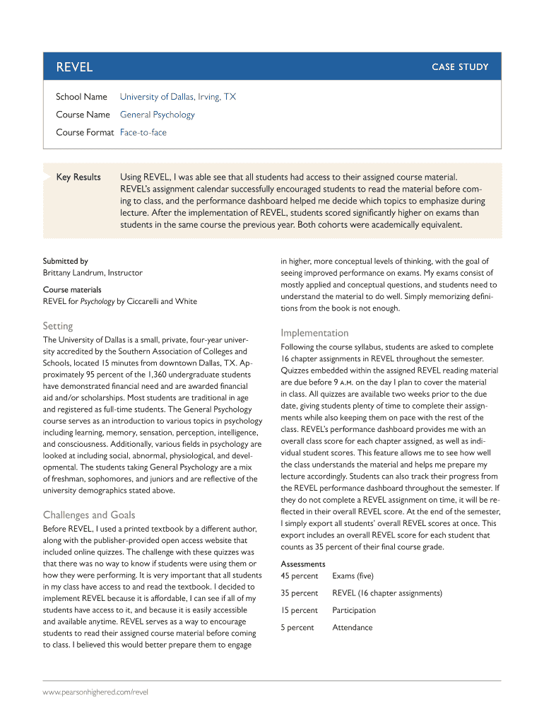 REVELSchool Preuniversity of Dallas, Irving, TX case studyCourse NameGeneral PsychologytCourse Format×FacetofaceKey Resulting REVEL, I was able to see that all students had access to their assigned