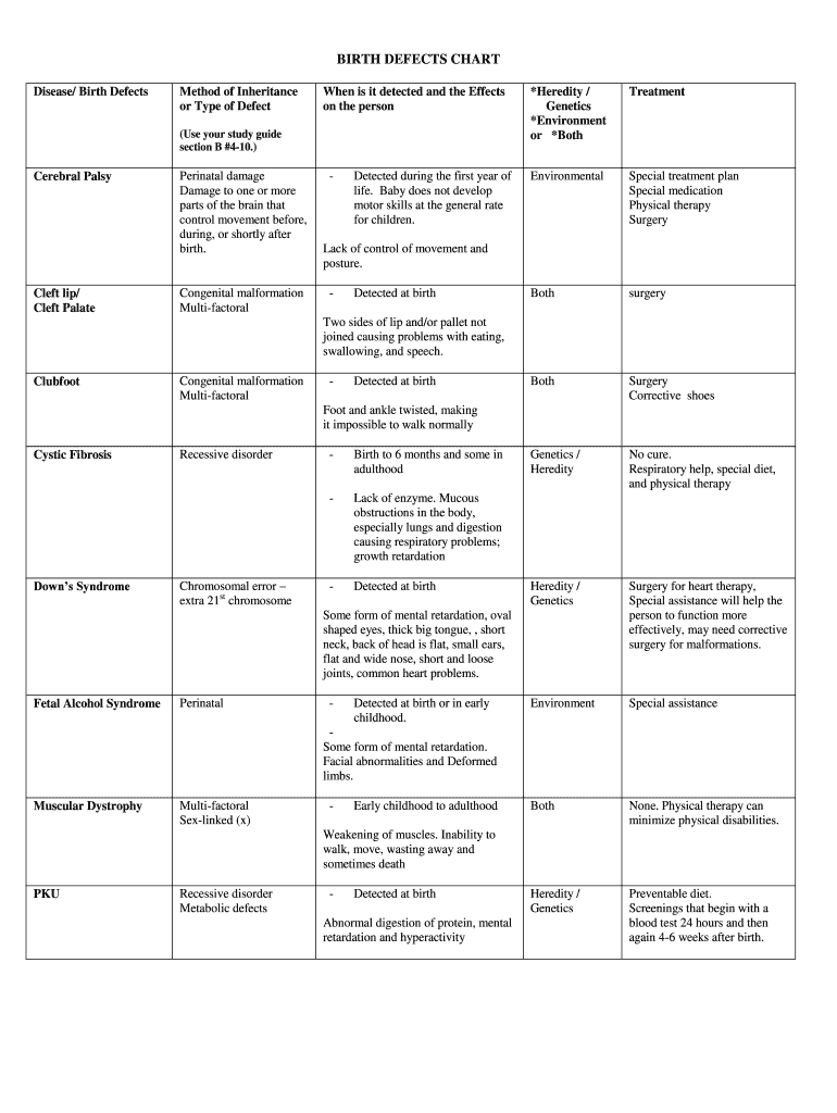 A birth defects chart is a document used to track and record any abnormalities or conditions present in a newborn baby.