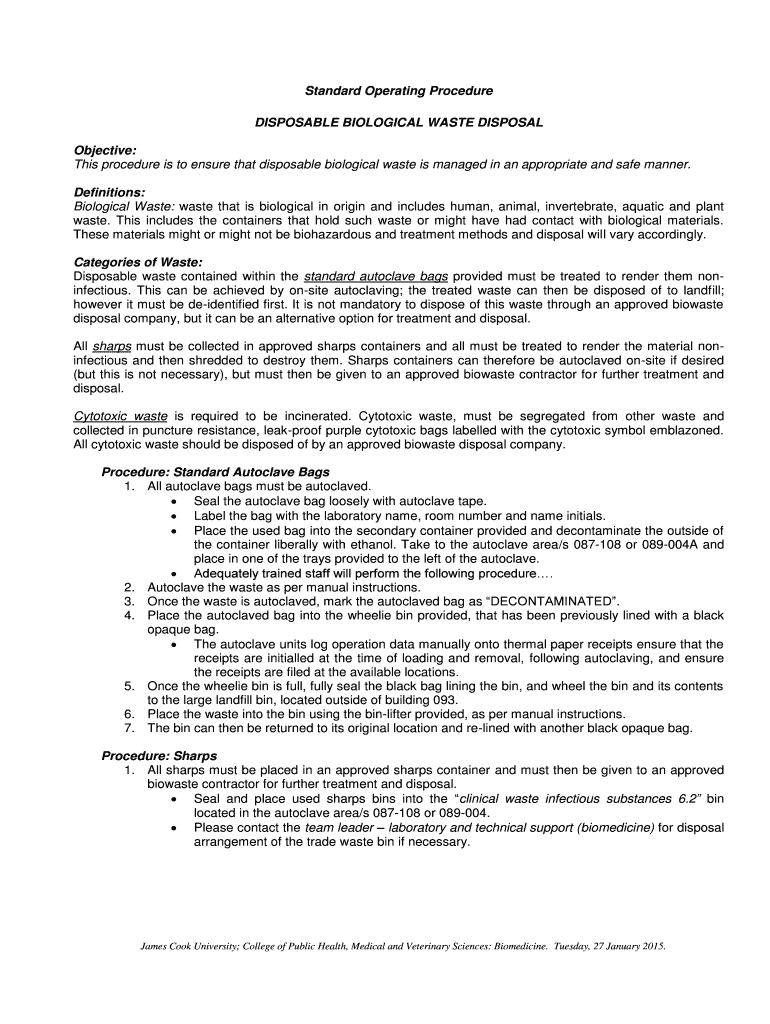 This procedure is to ensure that disposable biological waste is managed in an appropriate and safe manner.