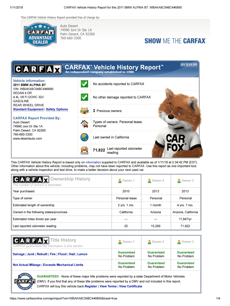 1/11/2018CARFAX Vehicle History Report for this 2011 BMW ALPINA B7: WBAKA8C54BC446890This CARFAX Vehicle History Report provided free of charge by:Auto Desert 74990 Joni Dr Ste 1A Palm Desert, CA