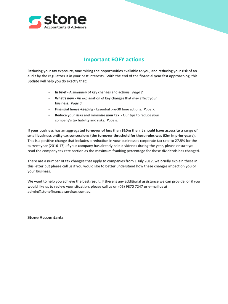 Important EOF actions Reducing your tax exposure, maximizing the opportunities available to you, and reducing your risk of an audit by the regulators is in your best interests. With the end of the