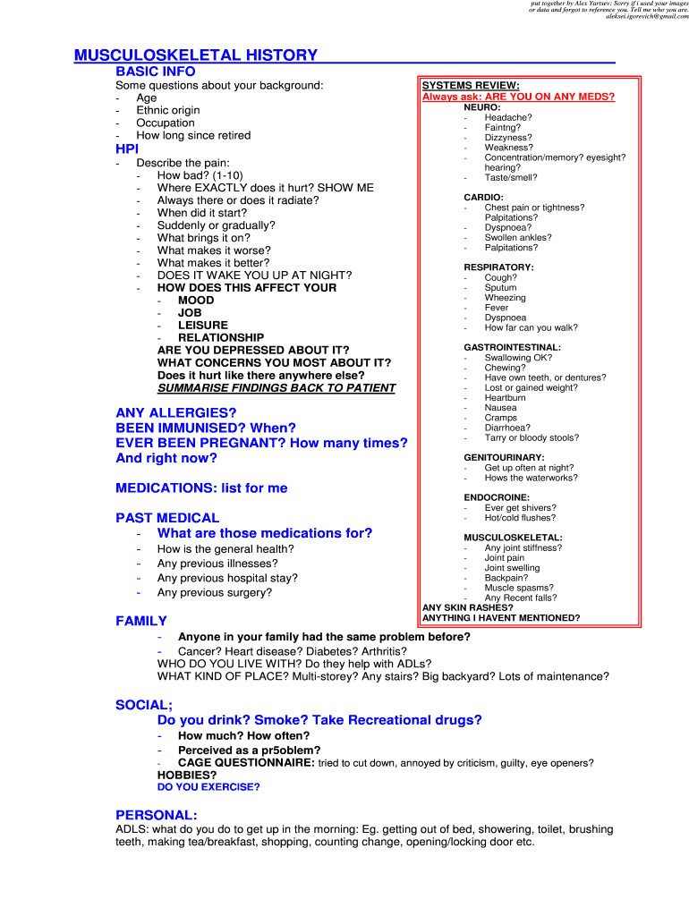 Put together by Alex Parties: Sorry if I used your images or data and forgot to reference you. Tell me who you are. Alaska. Gorelick Gmail. Musculoskeletal HISTORY BASIC INFO Some questions about