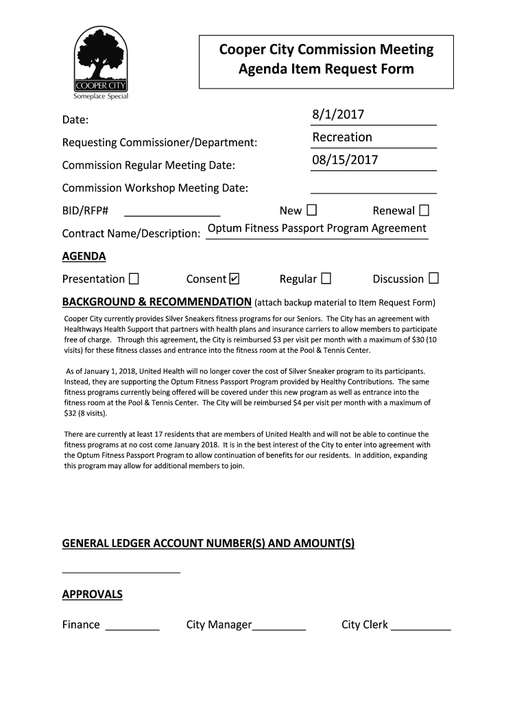 Cooper City Commission Meeting Agenda Item Request Form Date:8/1/2017 Requesting Commissioner/Department:Recreation Commission Regular Meeting Date:08/15/2017 Commission Workshop Meeting Date: BID/RFP#