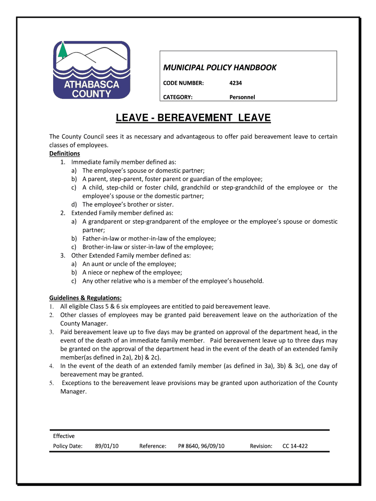 MUNICIPAL POLICY HANDBOOK CODE NUMBER:4234CATEGORY:PersonnelLEAVE BEREAVEMENT LEAVE The County Council sees it as necessary and advantageous to offer paid bereavement leave to certain classes of employees.