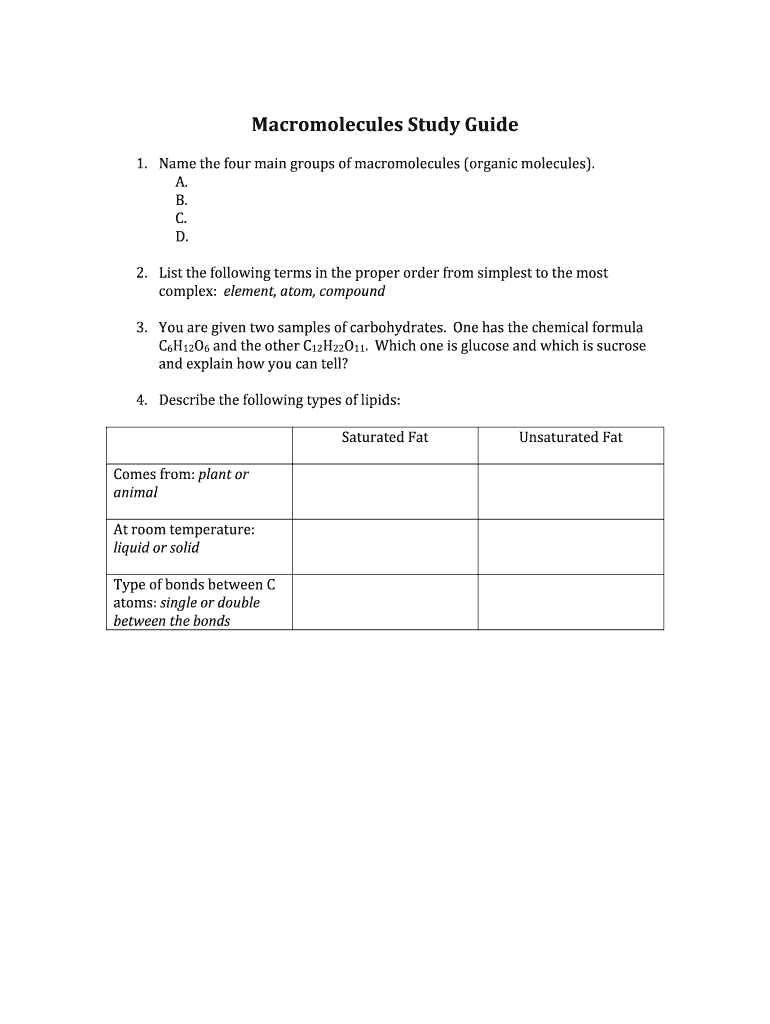 3.Before you begin filling out the form, gather the necessary information that will assist in answering the guide’s questions, such as notes on carbohydrates, lipids, proteins, and nucleic acids.