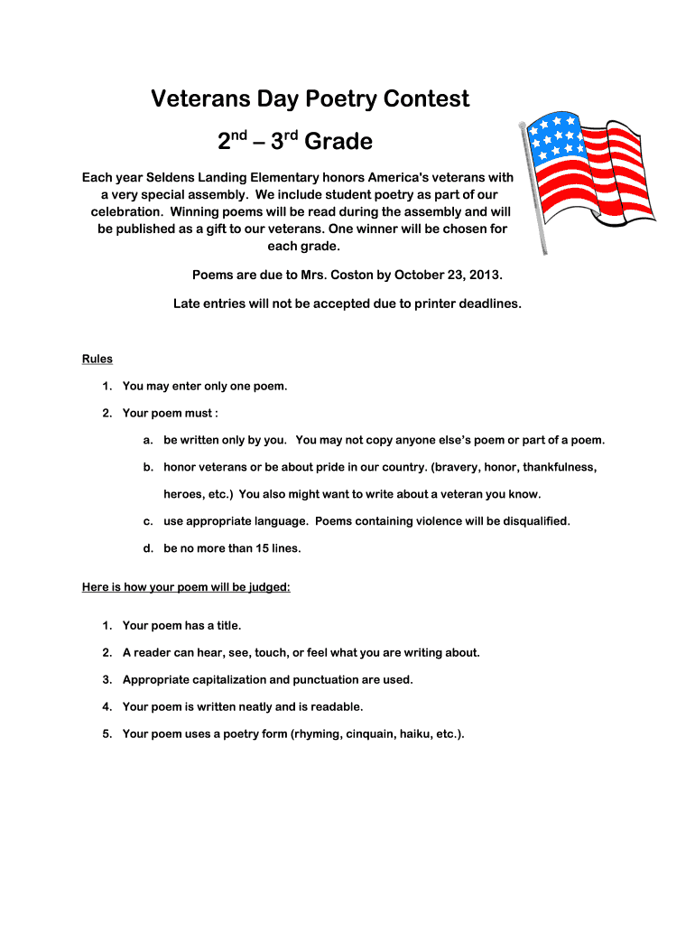 Veterans Day Poetry Contest 2nd 3rd Grade Each year Elders Landing Elementary honors America's veterans with a very special assembly. We include student poetry as part of our celebration. Winning