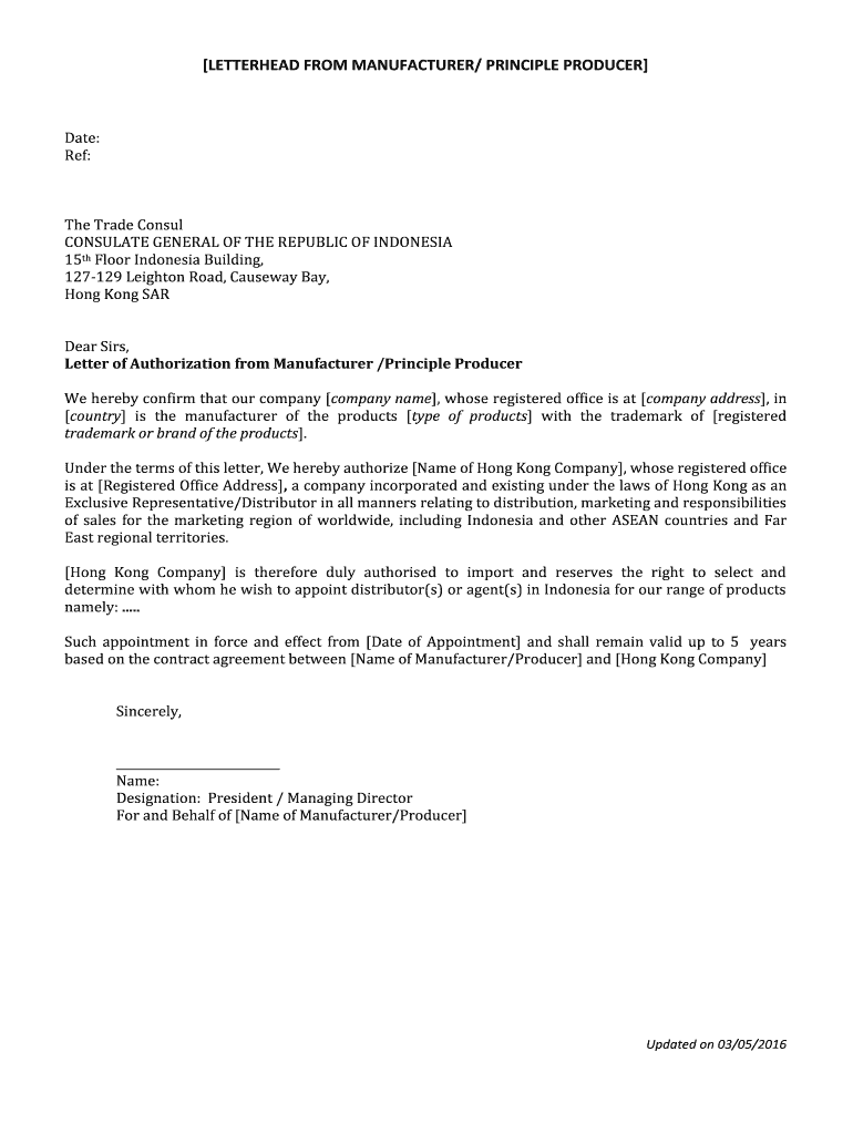 LETTERHEAD FROM MANUFACTURER/ PRINCIPLE PRODUCER Date: Ref:The Trade Consul CONSULATE GENERAL OF THE REPUBLIC OF INDONESIA 15th Floor Indonesia Building, 127129 Leighton Road, Causeway Bay, Hong Kong