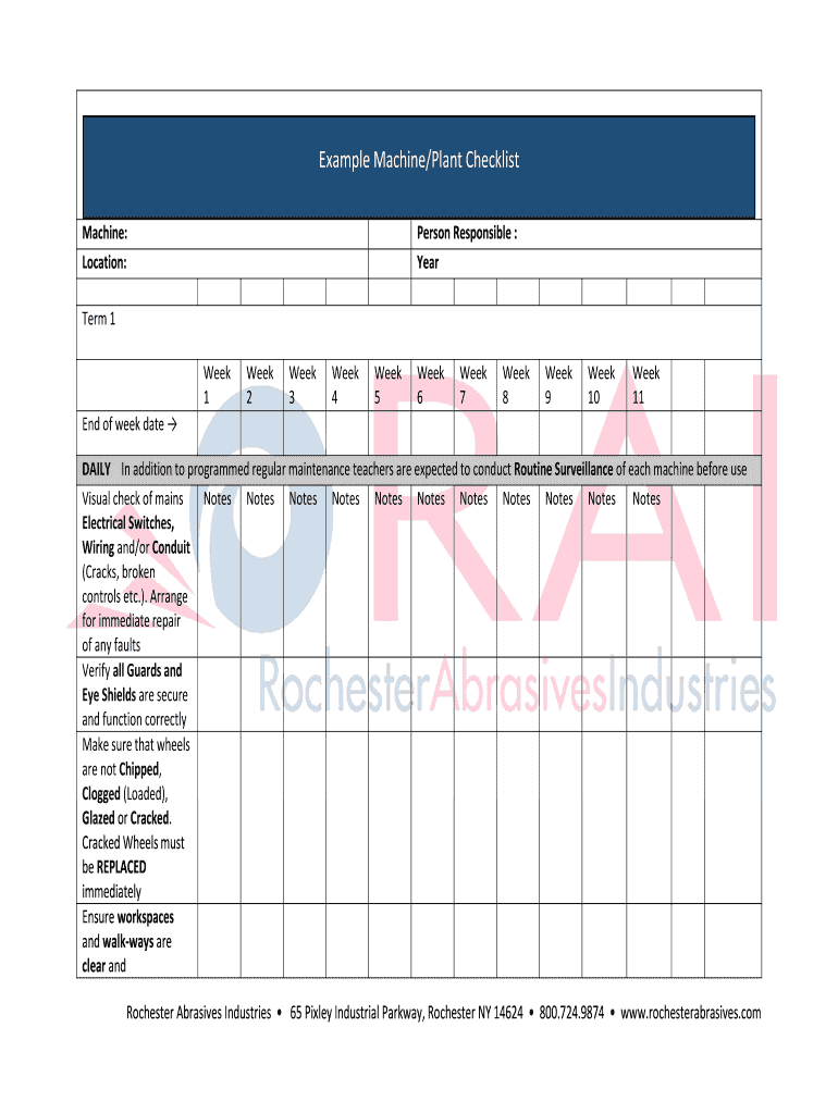 Example Machine/Plant Checklist Machine: Location:Person Responsible : Preterm 1 Week 1Week 2Week 3Week 4Week 5Week 6Week 7Week 8Week 9Week 10Week 11End of week date DAILY In addition to programmed