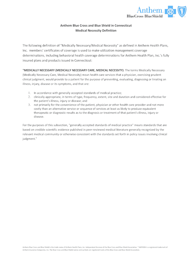 Medical Necessity Definition following definition of Medically Necessary/Medical Necessity as defined in Anthem Health Plans,