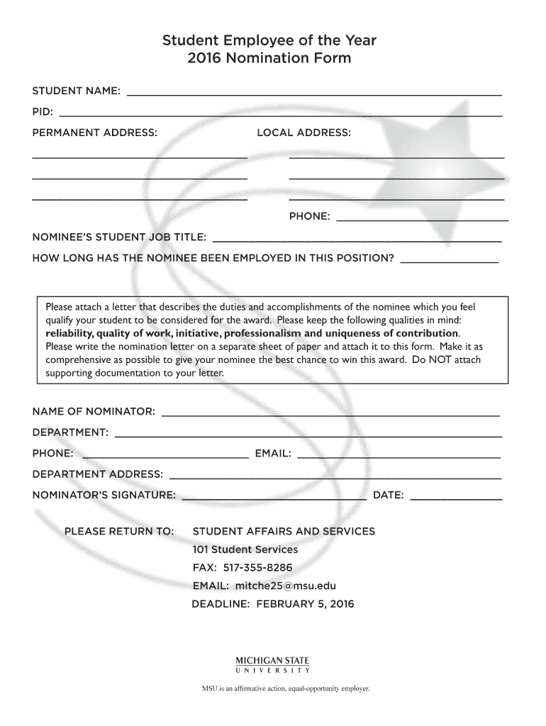 Get the free Nominate your outstanding student employees by February 5, 2016