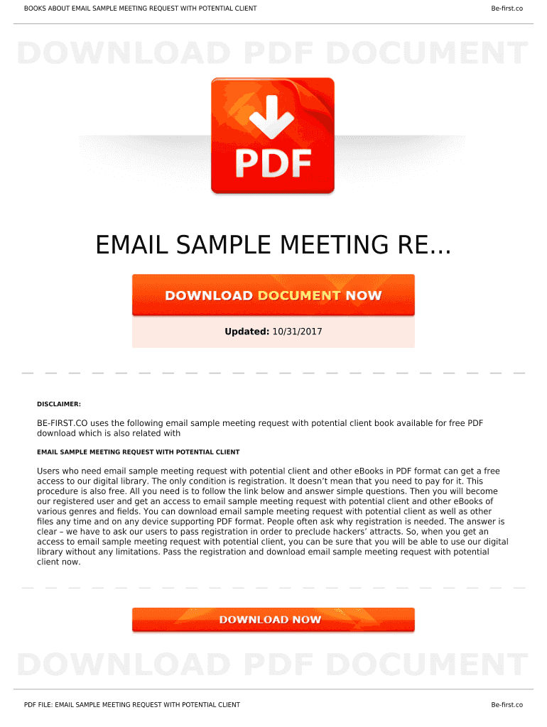 BOOKS ABOUT EMAIL SAMPLE MEETING REQUEST WITH POTENTIAL CLIENTBerst. Email SAMPLE MEETING RE... Updated: 10/31/2017DISCLAIMER:FIRST.CO uses the following email sample meeting request with potential