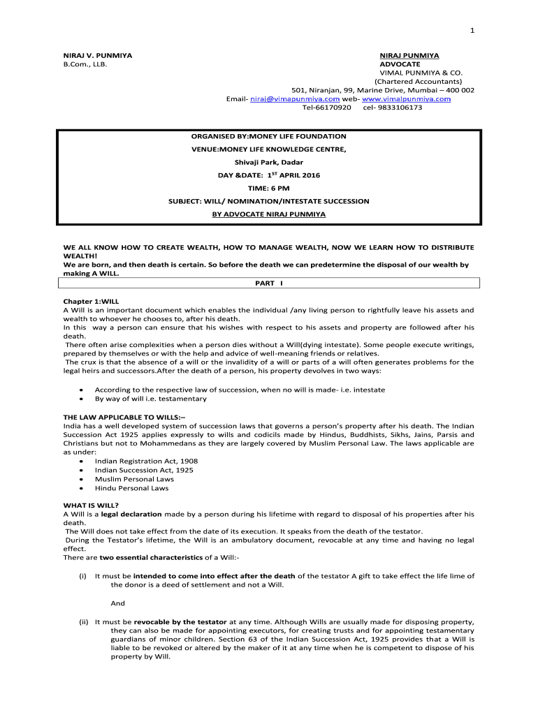 1 NI RAJ V. PUNISH B.Com., LLB.NI RAJ PUNISH ADVOCATE VITAL PUNISH & CO. (Chartered Accountants) 501, Iranian, 99, Marine Drive, Mumbai 400 002 Email Iraq vimapunmiya.com web www.vimalpunmiya.com