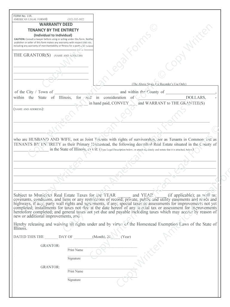 FORM No. 11R.AMERICAN LEGAL FORM (312) 3321922WARRANTY DEED TENANCY BY THE ENTIRETY (Individual to Individual)CAUTION: Consult a lawyer before using or CNG under this form. Neither publisher nor seller