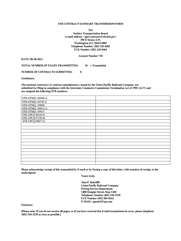 STB CONTRACT SUMMARY TRANSMISSION FORM TO: Surface Transportation Board (email address Agra. Contracts STB.dot.gov) 395 E Street, S.W. Washington, D.C.204230001 Telephone Number (202) 2450281 FAX