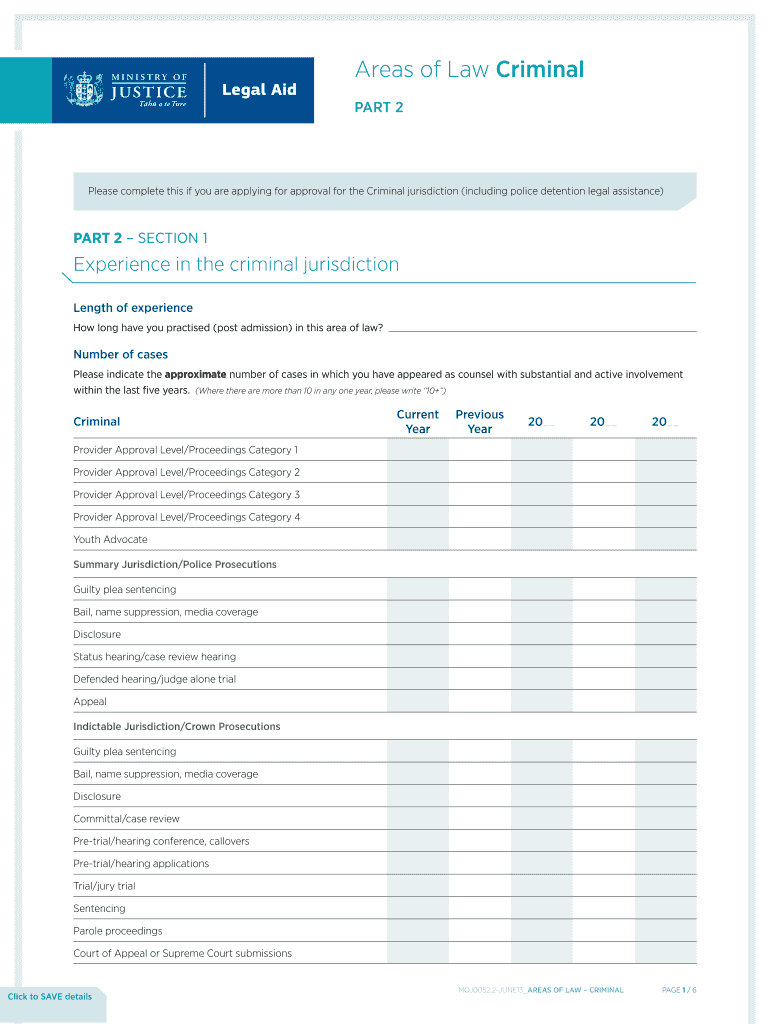 Areas of Law Criminal Part 2Please complete this if you are applying for approval for the Criminal jurisdiction (including police detention legal assistance)PART 2 Section 1Experience in the criminal