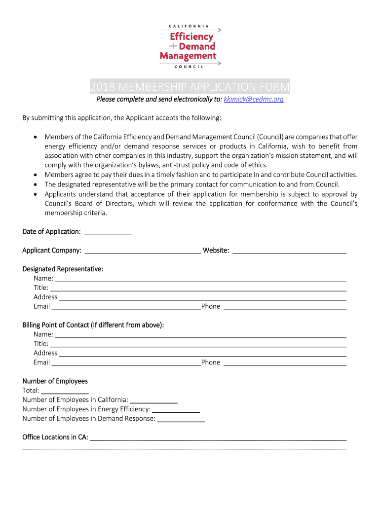 2018 MEMBERSHIP APPLICATION FORM Please complete and send electronically to: kick ceded.org By submitting this application, the Applicant accepts the following: Members of the California Efficiency
