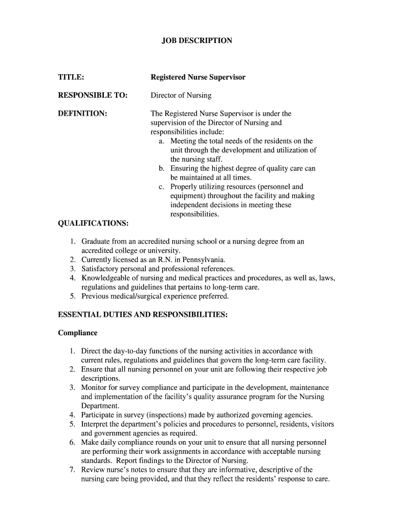 JOB DESCRIPTIONTITLE:Registered Nurse SupervisorRESPONSIBLE TO:Director of NursingDEFINITION:The Registered Nurse Supervisor is under the