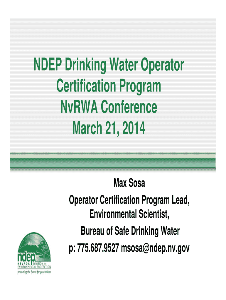 NEP Drinking Water Operator Certification Program Norway Conference March 21, 2014, Max Sosa Operator Certification Program Lead, Environmental Scientist, Bureau of Safe Drinking Water p: 775.687.9527