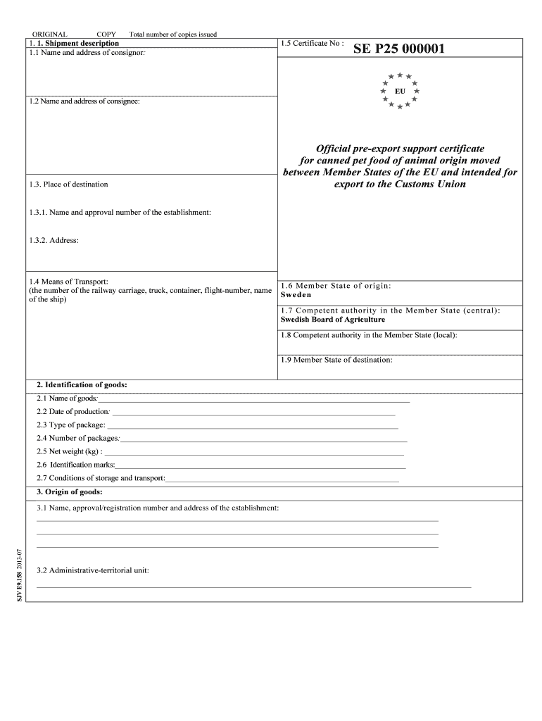 ORIGINAL COPY Total number of copies issued 1. 1. Shipment description 1.1 Name and address of consignor: 1.5 Certificate No : SE P25 000001 EU 1.2 Name and address of consignee: 1.3. Place of destination