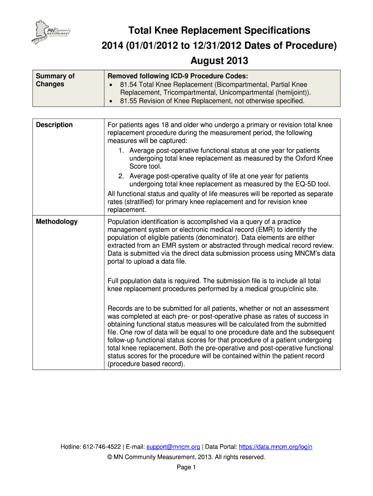 Total Knee Replacement Specifications 2014 (01/01/2012 to 12/31/2012 Dates of Procedure) August 2013 Summary of ChangesRemoved following ICD9 Procedure Codes: 81.54 Total Knee Replacement (Bi compartmental,