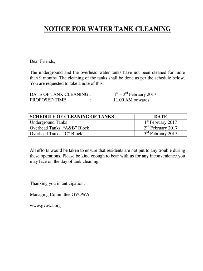 NOTICE FOR WATER TANK CLEANINGDear Friends, The underground and the overhead water tanks have not been cleaned for more than 9 months. The cleaning of the tanks shall be done as per the schedule below.