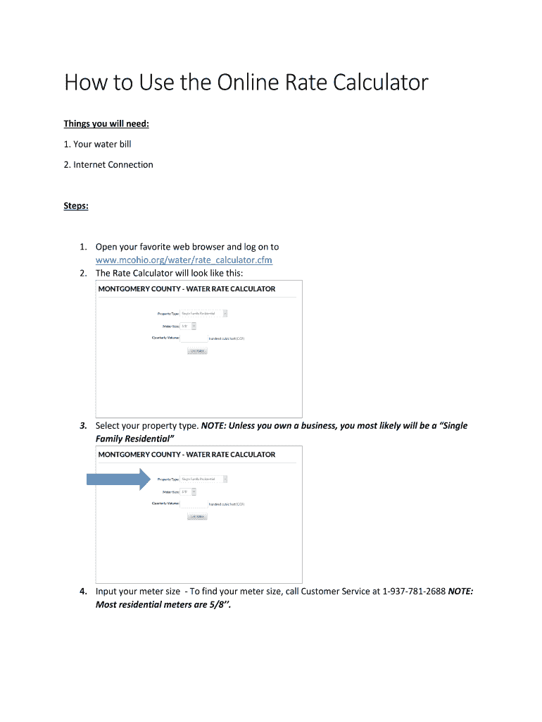 How to Use the Online Rate Calculator Things you will need: 1. Your water bill 2. Internet Connectionless:1. Open your favorite web browser and log on to www.mcohio.org/water/rate calculator. CFM
