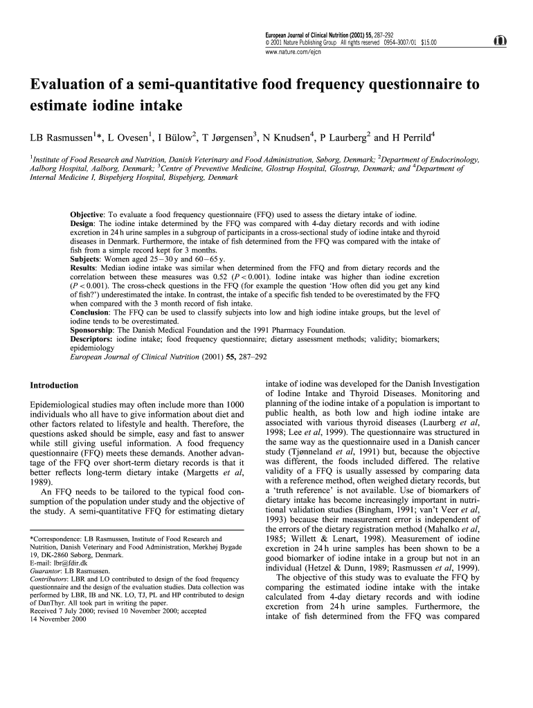 European Journal of Clinical Nutrition (2001) 55, 287292 2001 Nature Publishing Group All rights reserved 09543007/01 ×15.00 www.nature.com/ejcnEvaluation of a semiquantitative food frequency questionnaire
