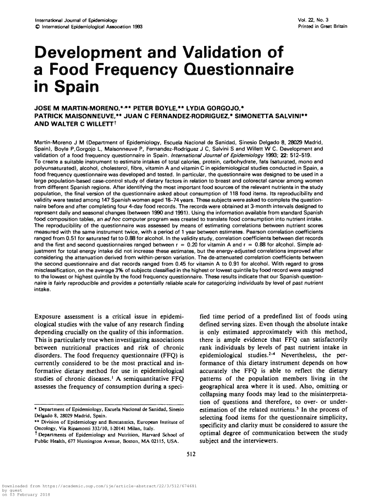 Vol. 22, No. 3 Printed in Great BritainInternational Journal of Epidemiology International Epidemiological Association 1993Development and Validation of a Food Frequency Questionnaire in Spain JOSE