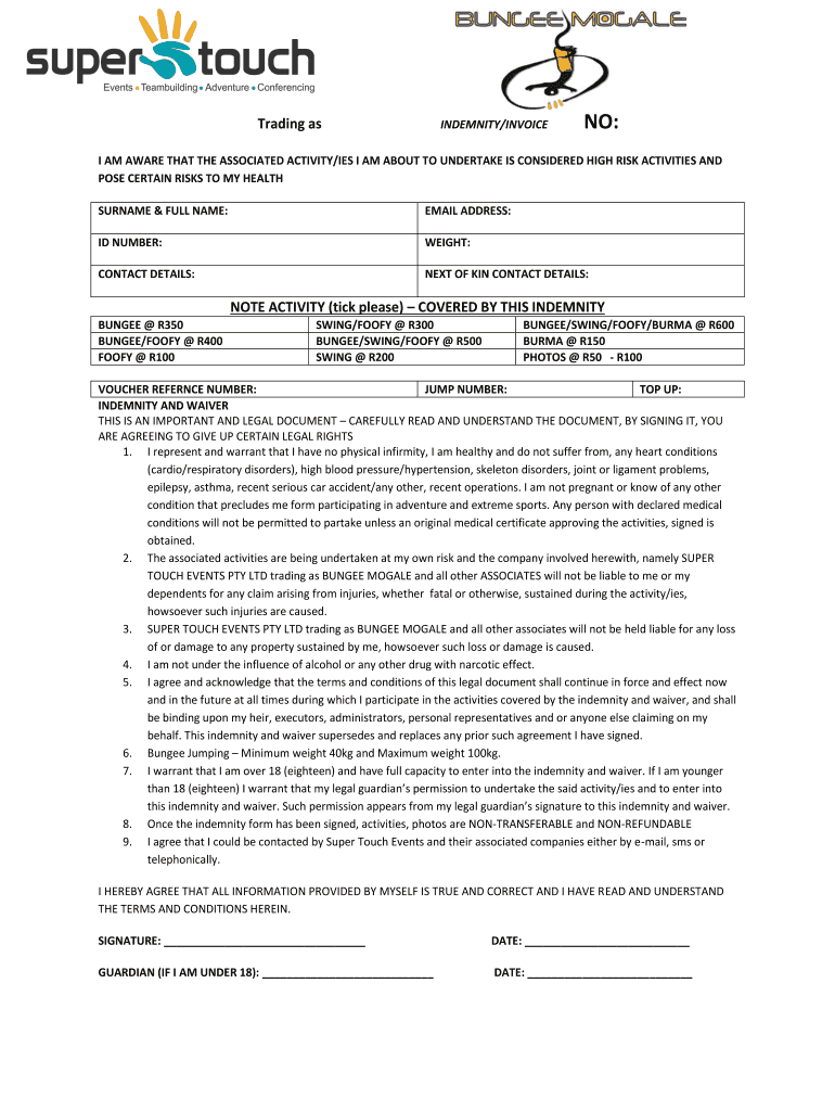 Trading indemnity/INVOICE NO:I AM AWARE THAT THE ASSOCIATED ACTIVITY/IES I AM ABOUT TO UNDERTAKE IS CONSIDERED HIGH RISK ACTIVITIES AND POSE CERTAIN RISKS TO MY HEALTH SURNAME & FULL NAME:EMAIL ADDRESS:ID