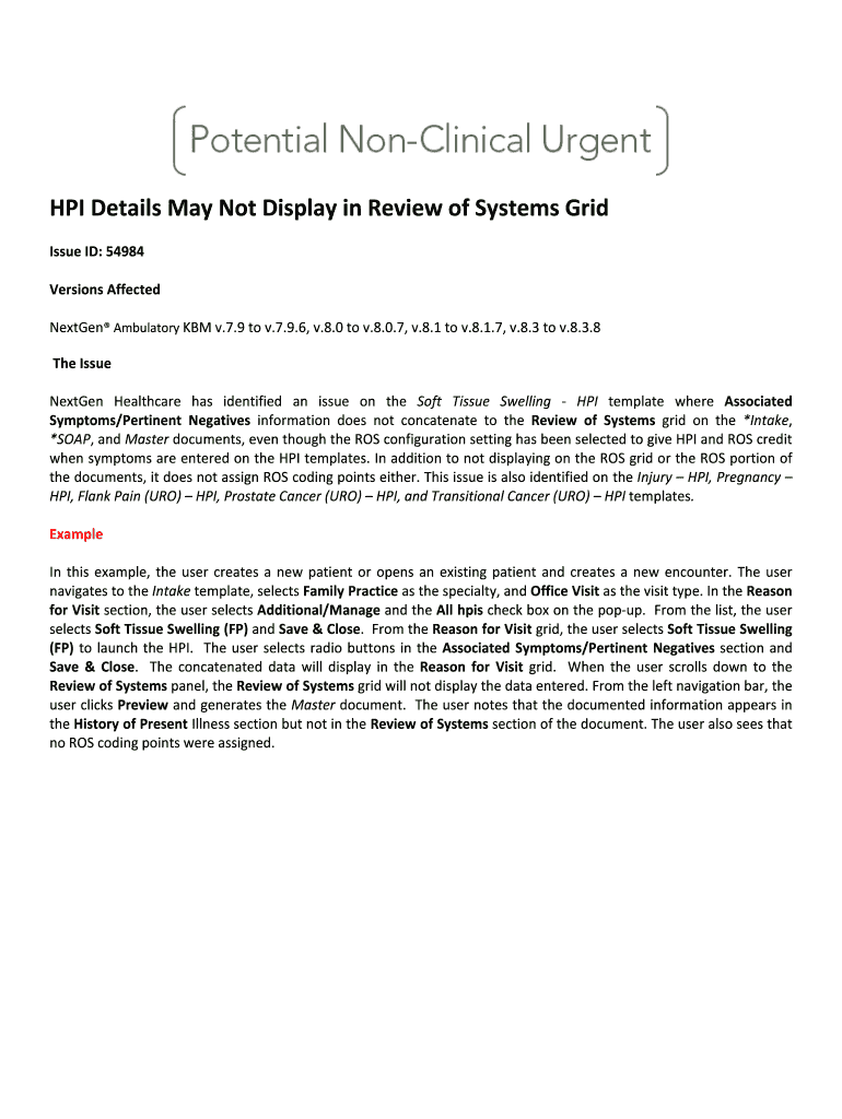 HP Details May Not Display in Review of Systems Grid Issue ID: 54984 Versions Affected Next Gen Ambulatory KM v.7.9 to v.7.9.6, v.8.0 to v.8.0.7, v.8.1 to v.8.1.7, v.8.3 to v.8.3.8 The Issue Next