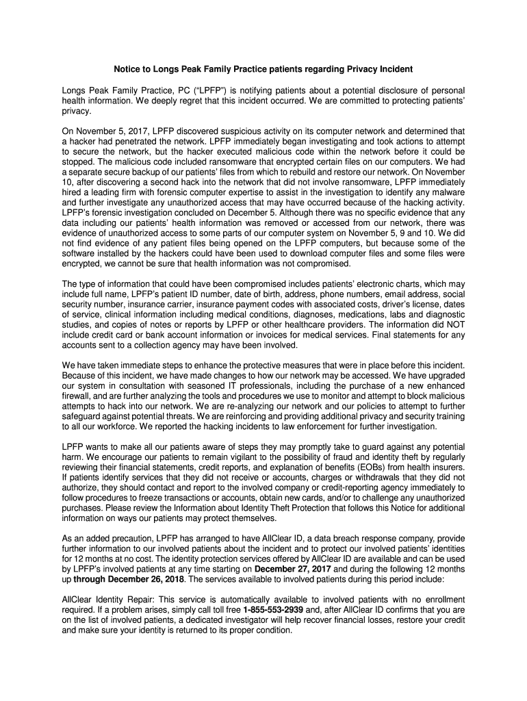 Get the free Notice to Longs Peak Family Practice patients regarding Privacy Incident