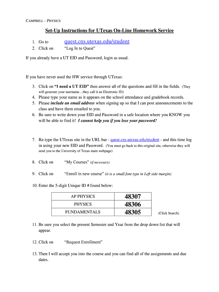 CAMPBELL PHYSICSSetUp Instructions for Texas Online Homework Service 1. Go to 2. Click conquest.cns.utexas.edu/student Log In to Question you already have a UT EID and Password, login as usual. If