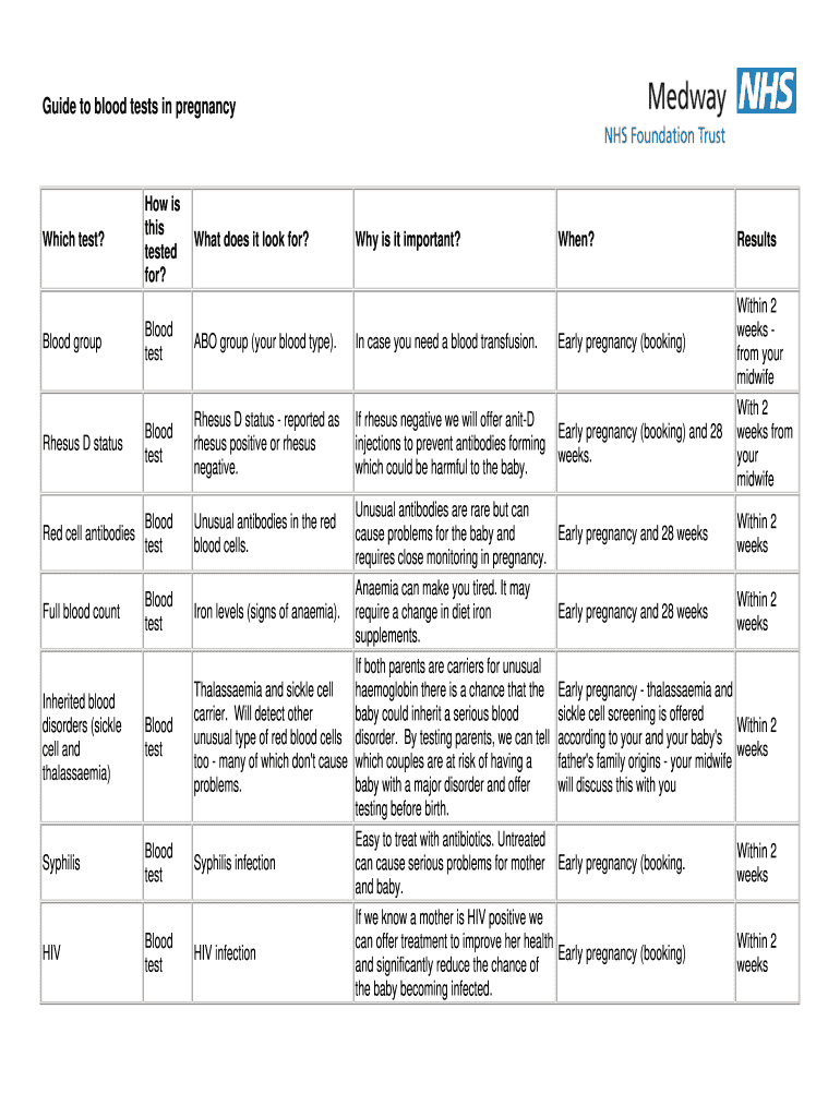 Guide to blood tests in pregnancyWhich test? How is this tested for? Blood groupBlood Gestapo group (your blood type). In case you need a blood transfusion. Early pregnancy (booking)Rhesus D statusBlood