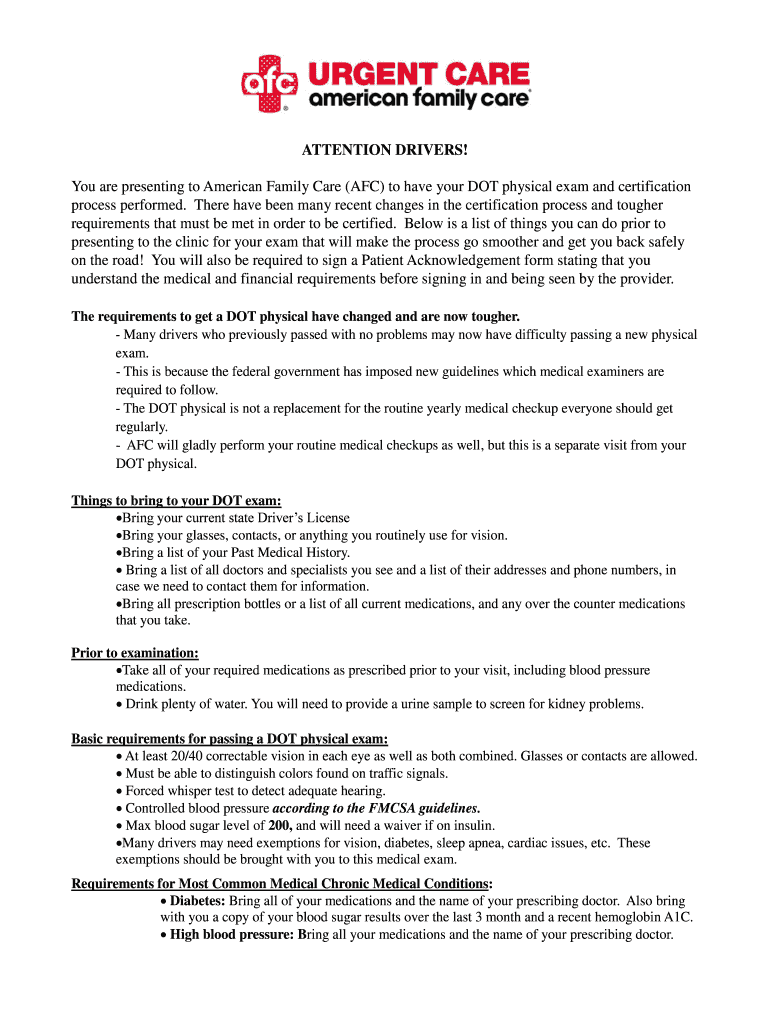 Get the free You are presenting to American Family Care (AFC) to have your DOT physical exam and ...