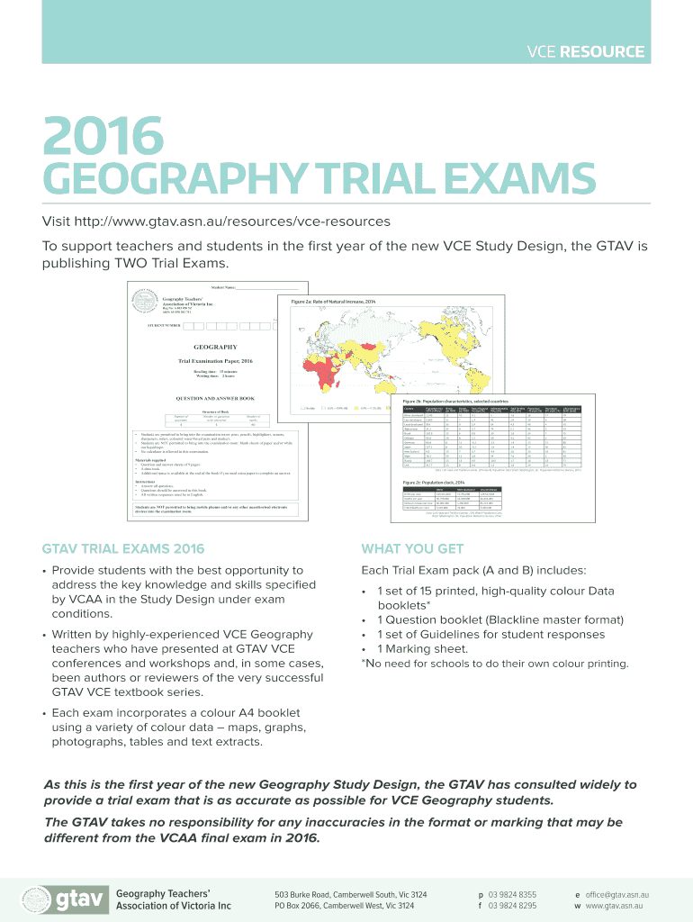 ICE RESOURCE2016GEOGRAPHY TRIAL EXAMS Visit http://www.gtav.asn.au/resources/vceresources To support teachers and students in the first year of the new ICE Study Design, the GTA is publishing TWO