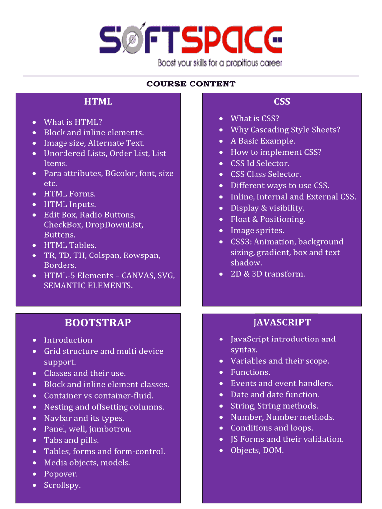COURSE CONTENT HTML What is HTML? Block and inline elements. Image size, Alternate Text. Unordered Lists, Order List, List Items. Para attributes, Color, font, size etc. HTML Forms. HTML Inputs. Edit