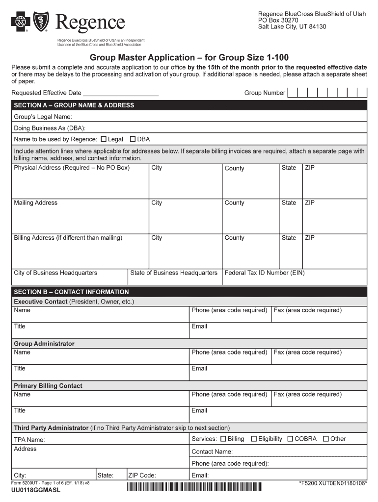 Regency Blue Cross Bluesier of Utah PO Box 30270 Salt Lake City, UT 84130Group Master Application for Group Size 1100Please submit a complete and accurate application to our office by the 15th of