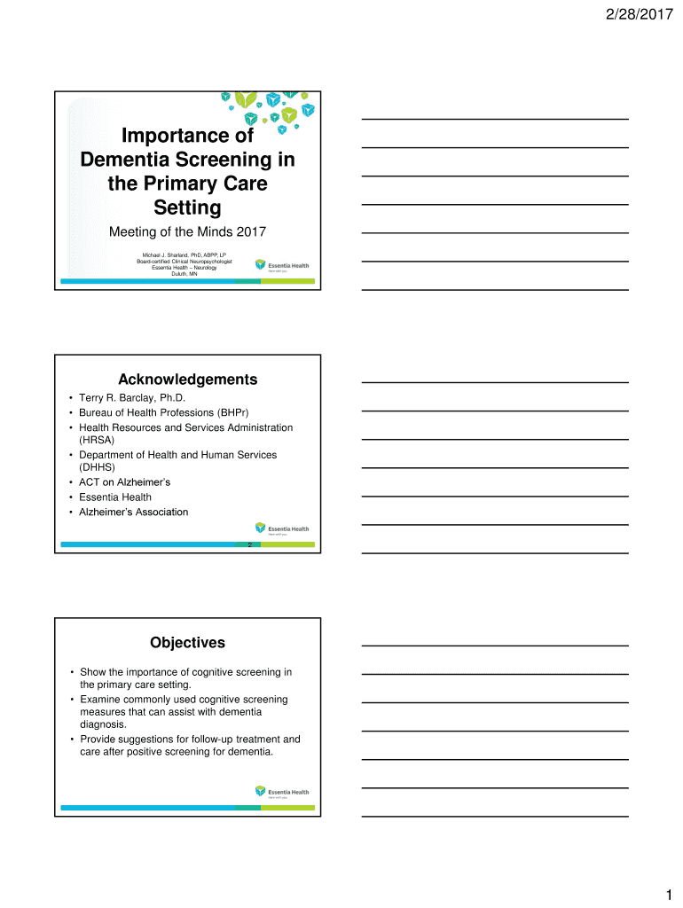 2/28/2017Importance of Dementia Screening in the Primary Care Setting Meeting of the Minds 2017 Michael J. Harland, PhD, APP, LP Board certified Clinical Neuropsychologist Essential Health Neurology