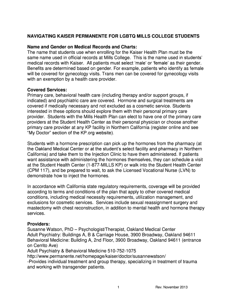 NAVIGATING KAISER PERMANENT FOR LGBTQ MILLS COLLEGE STUDENTS