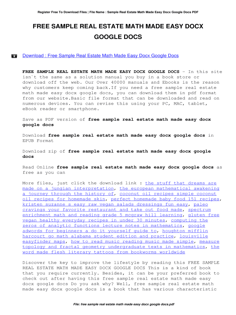 Register Free To Download Files File Name : Sample Real Estate Math Made Easy DOCX Google Docs FREE SAMPLE REAL ESTATE MATH MADE EASY DOCX GOOGLE DOCS Download : Free Sample Real Estate Math Made