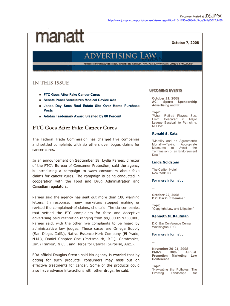 Document hosted at http://www.jdsupra.com/post/documentViewer.aspx?fid11541798e8654bd5ba595af3012bbf66October 7, 2008FTC Goes After Fake Cancer Cures Senate Panel Scrutinizes Medical Device Ads Jones