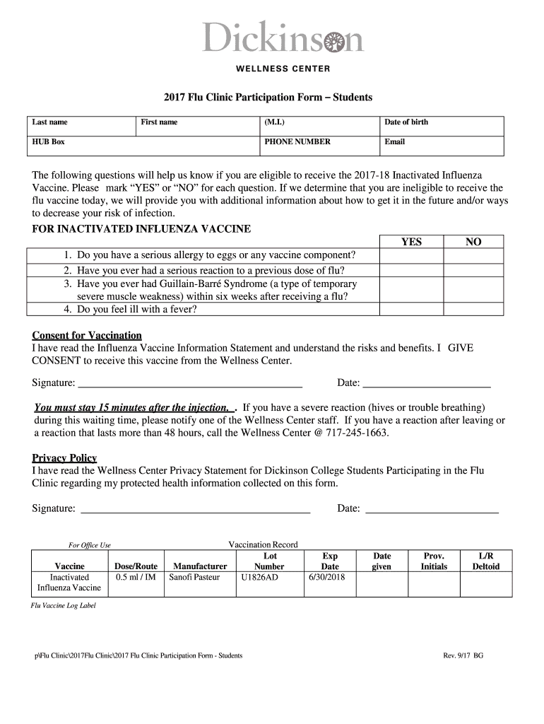 Get the free 2017 Flu Clinic Participation Form Students
