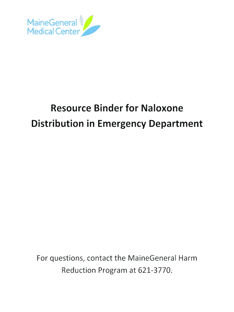 Resource Binder for Naloxone Distribution in Emergency Department questions, contact the MaineGeneral Harm Reduction Program at 6213770. This binder includes: Training slides Criteria for dispensing
