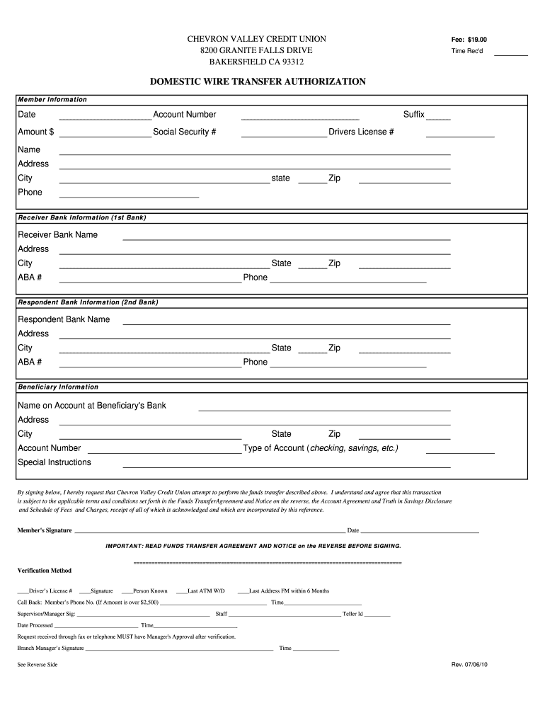 CHEVRON VALLEY CREDIT UNION 8200 GRANITE FALLS DRIVE BAKERSFIELD CA 93312 Fee: $19.00 Time Recd DOMESTIC WIRE TRANSFER AUTHORIZATION Member Information Date Account Number Amount $ Suffix Social Security