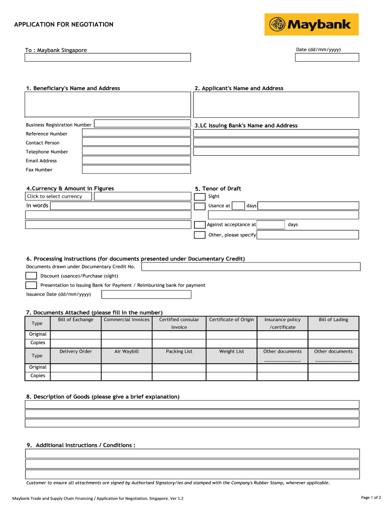 The Maybank Application for Negotiation is a crucial form used to request negotiation services from Maybank Singapore, pivotal in the trade financing landscape. This application facilitates access to trade financing, making it essential for businesses engaged in international trade. Its role in streamlining processes allows applicants to clearly present their needs and documentation, significantly impacting the trade financing environment in Singapore.