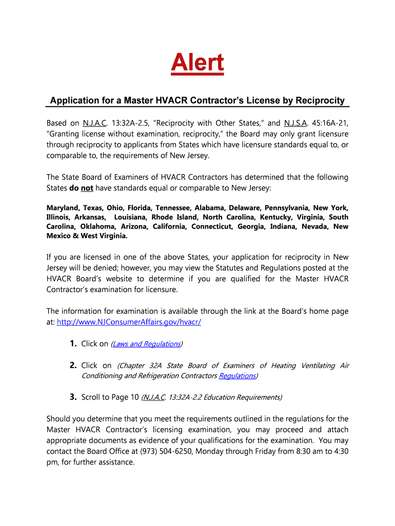Alert Application for a Master HVAC Contractors License by Reciprocity Based on N.J.A.C. 13:32A2.5, Reciprocity with Other States, and N.J.S.A. 45:16A21, Granting license without examination, reciprocity,